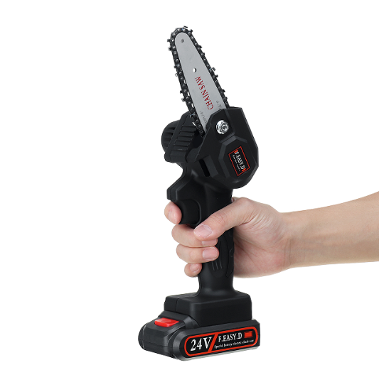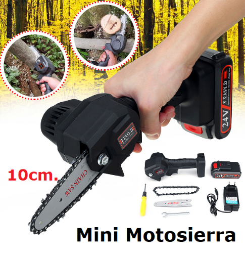 Sierra eléctrica recargable para carpintería, corte de árboles, leña, poda, huertas, tableros y más. Tiene una fuerte cadena de acero de alto carbono, de 28 dientes más batería recargable de 24 v. de Li-ion.